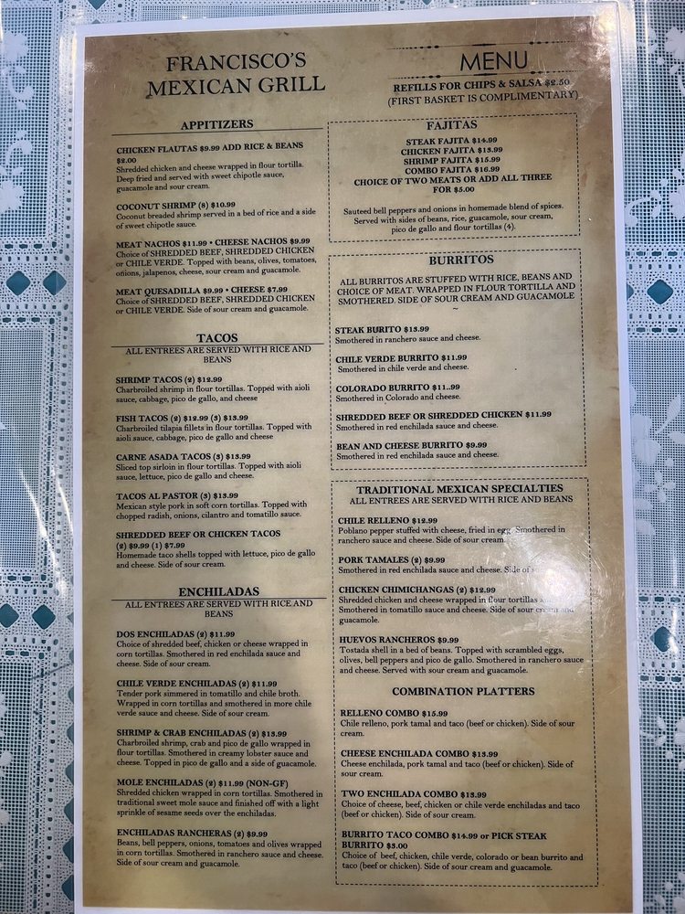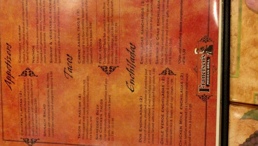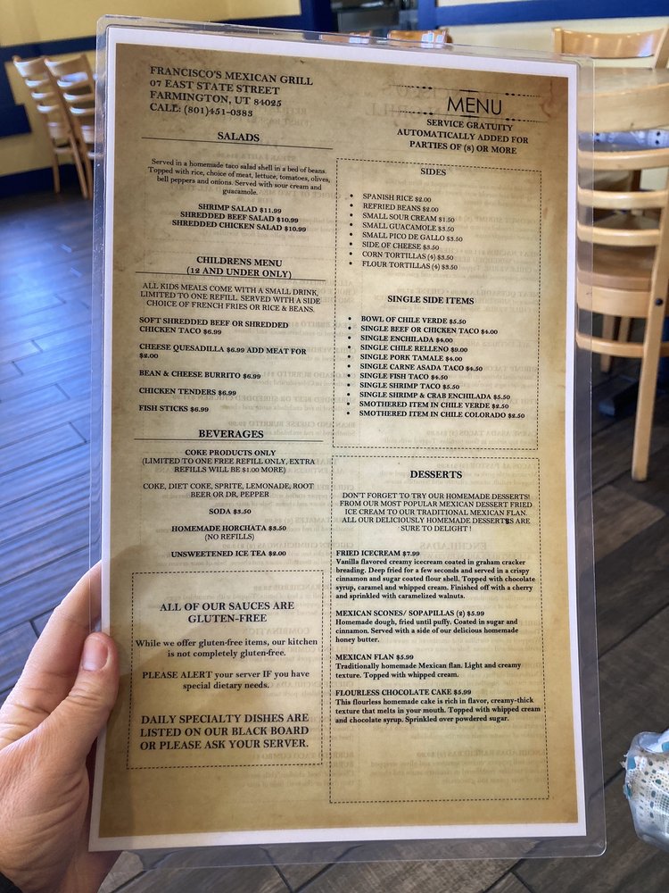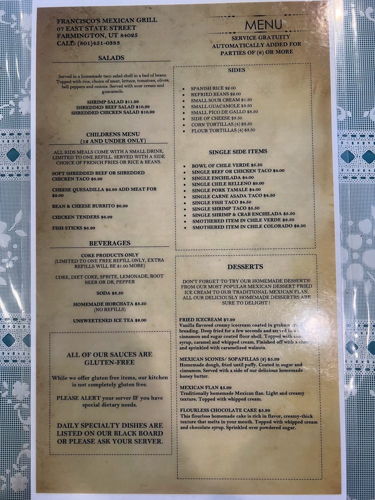 Francisco's Mexican Grill is a Mexican restaurant located at 7 E State St Farmington, UT 84025. Known for its outstanding quality, service, and affordable prices, it has become a favorite spot for many customers. The menu offers a variety of options, including beef tacos, cheese enchiladas, Taco pastor, chili Verde burrito, chicken chimichangas, fajitas combo, coconut shrimp, and seafood enchiladas. Customers rave about the delicious flavors and generous portions of the dishes. The ambience is cozy, and the staff is friendly, providing quick service. The restaurant also offers takeout, delivery, and catering options. With a focus on traditional Mexican cuisine and attentive customer service, Francisco's Mexican Grill continues to impress diners with its authentic flavors and inviting atmosphere.